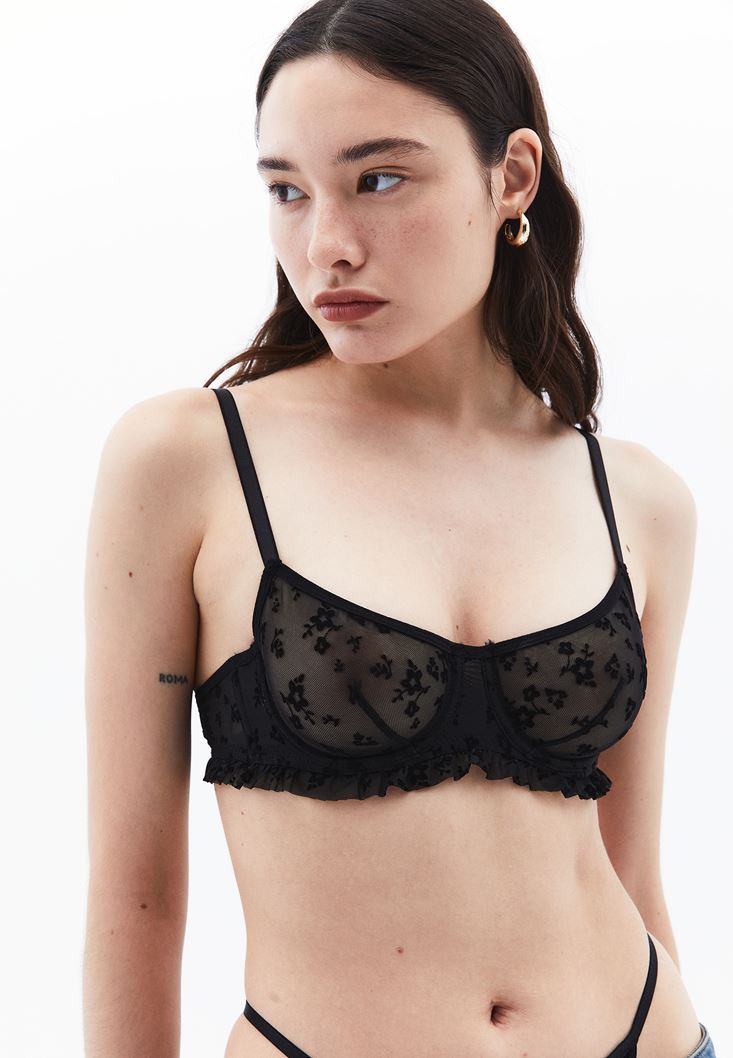 Siyah İnce Askılı Tül Detaylı Bralet